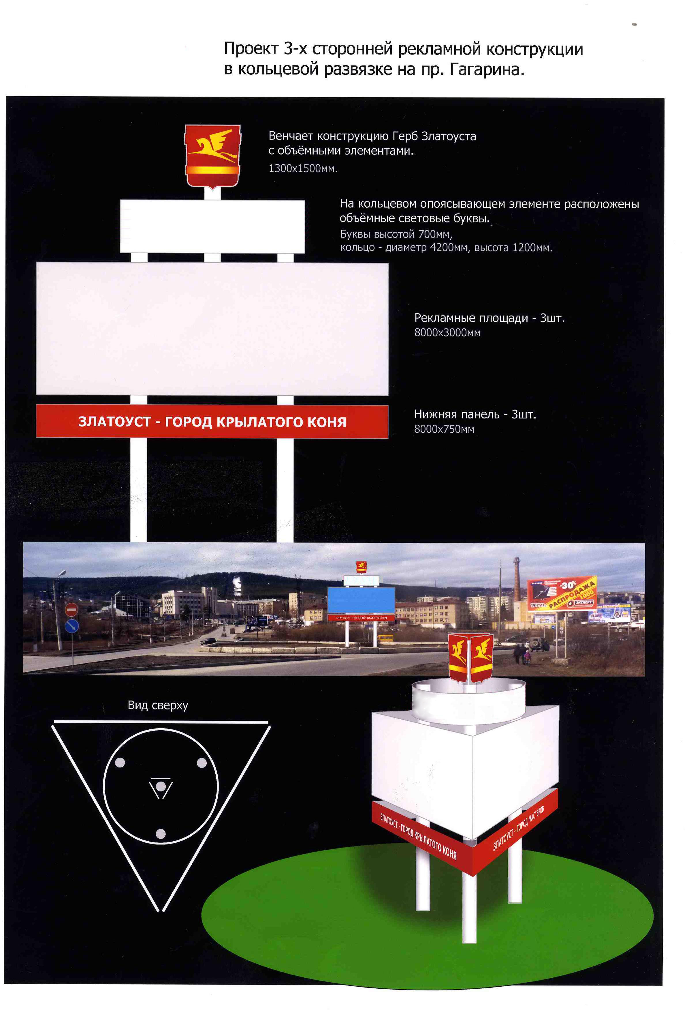 - на трех металлических трубах с трех сторон крепятся рекламные щиты 8000х3000мм, над ними кольцо диаметром 4200мм высотой 1200мм;
