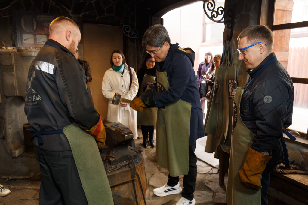 Далее экскурсионный маршрут привел гостей в оружейную слободу «АиРовка». Это пространство, где бережно сохраняются и демонстрируются вековые традиции златоустовских оружейников. Посол Вонгсинсават Сасиват не ограничился ролью наблюдателя: вместе с главой округа Олегом Решетниковым он принял участие в кузнечном мастер‑классе «Кованое сердце». В ходе занятия они своими руками выковали символические «Уральские сердца» – памятные сувениры, олицетворяющие теплоту приема и открытость к сотрудничеству.
