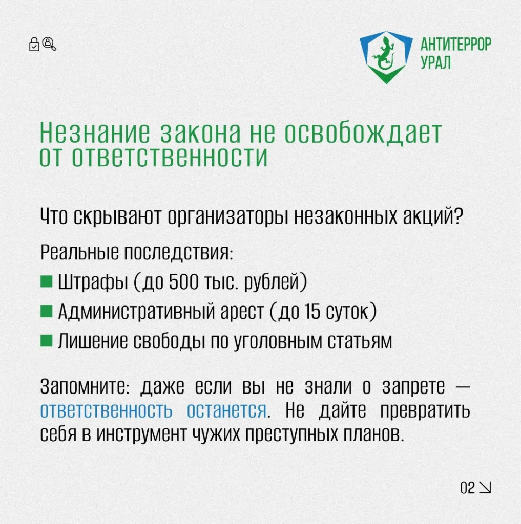 Участие в подобных мероприятиях может привести к нарушению общественного порядка, провоцированию уличных беспорядков (https://max.ru/antiterror_ural/AZy8YPzKLFE) и, как следствие, к уголовной ответственности. Организаторы противоправных акций зачастую скрывают истинный преступный характер своих действий, убеждая граждан в мнимой «законности» таких событий.