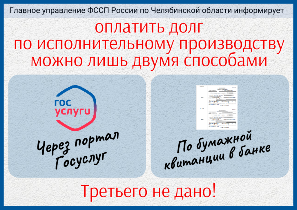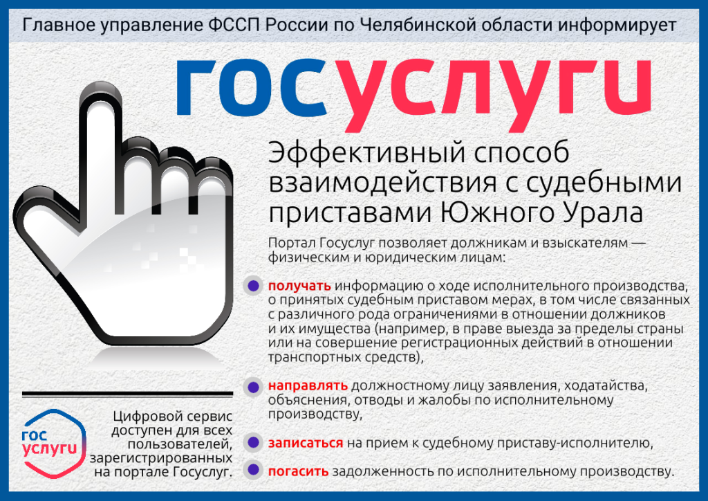 ГУФССП России по Челябинской области рекомендует гражданам не доводить исполнение судебных решений до этапа принудительного взыскания, а самостоятельно и добровольно контролировать свои долги. Для этого есть все возможности.