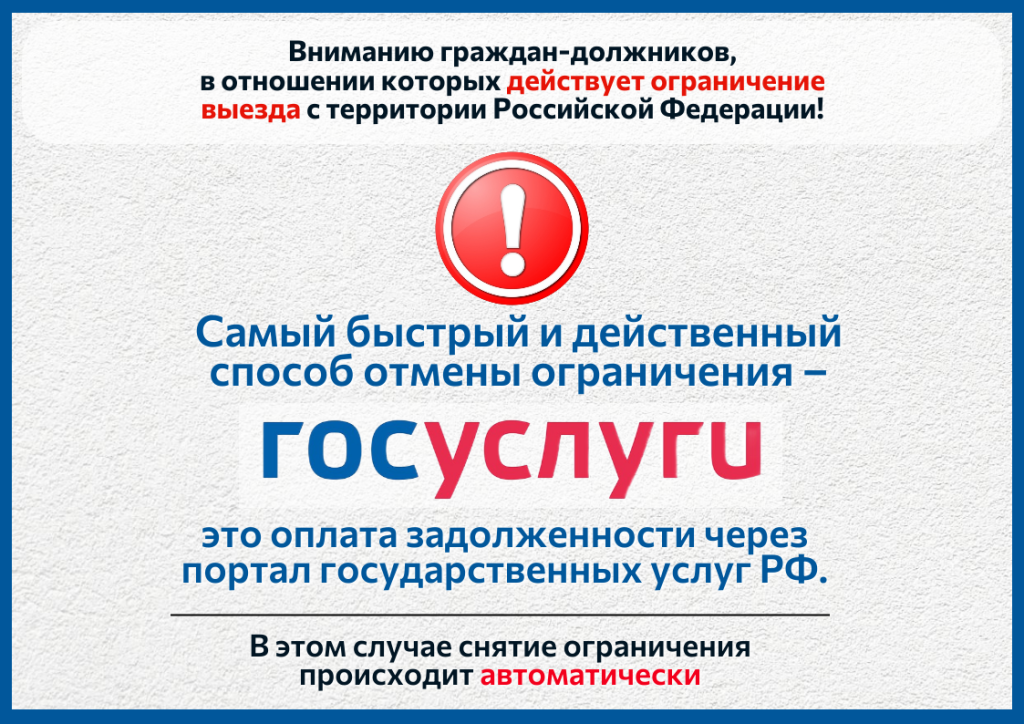 Гражданам, планирующим провести новогодние каникулы за рубежом, следует знать, что в целях оперативного снятия ограничения на выезд за пределы Российской Федерации следует оплачивать долги через Госуслуги. Сведения об уплате будут немедленно приняты Государственной информационной системой государственных и муниципальных платежей (ГИС ГМП). Как только информация об оплате долга появится в ГИС ГМП, постановление о снятии запрета на выезд должника из Российской Федерации будет вынесено в АВТОМАТИЧЕСКОМ режиме.