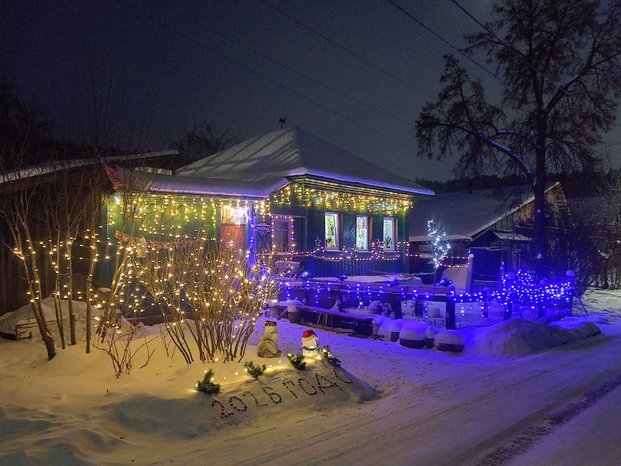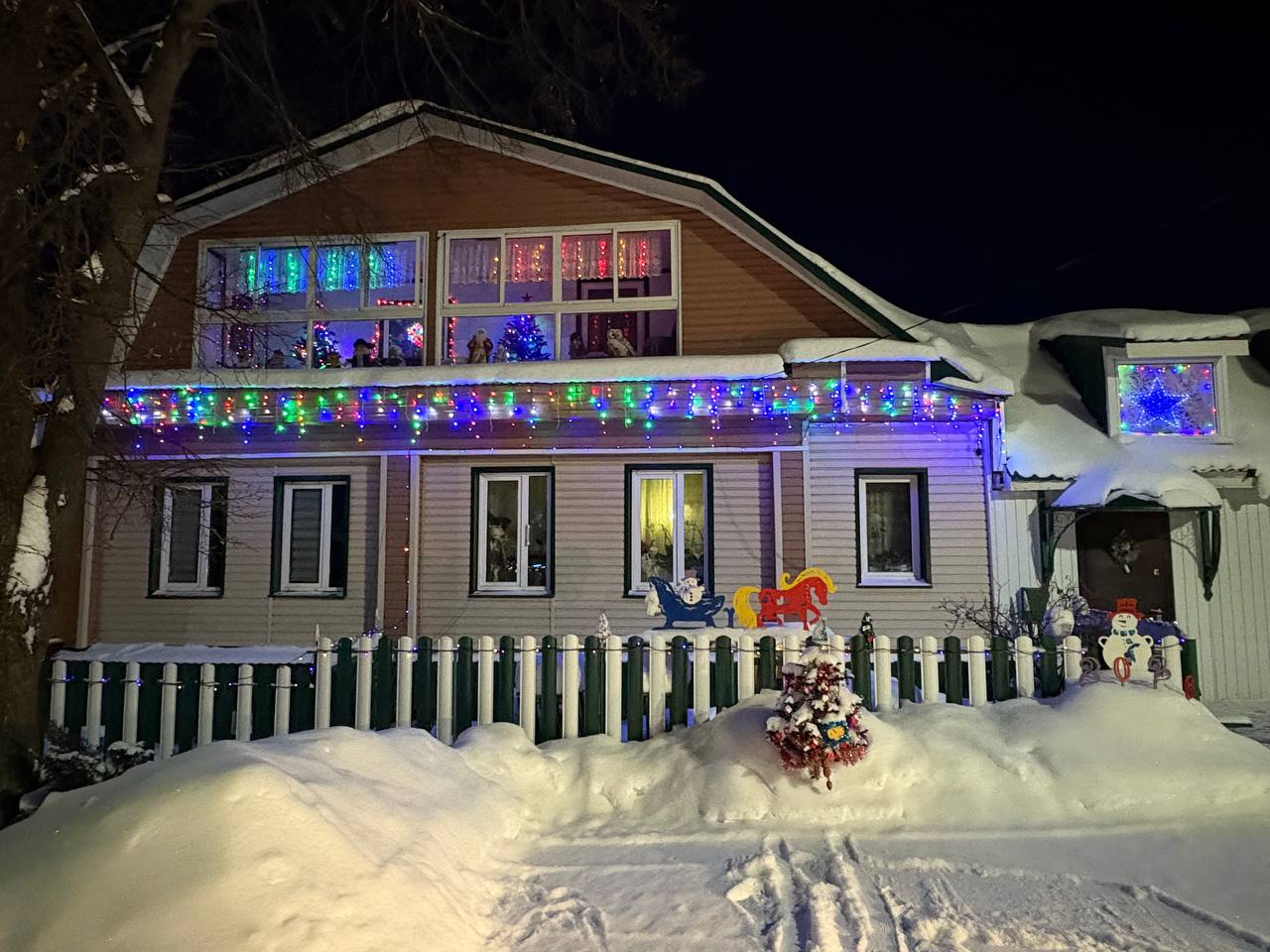 Заслуженное первое место у Петра Кондратьева, улица Трудовая, 14. Праздничная иллюминация протянулась по всему фасаду дома, опоясала палисадник, украсила кустарники у дома. Гостей встречает заяц в красном колпаке.