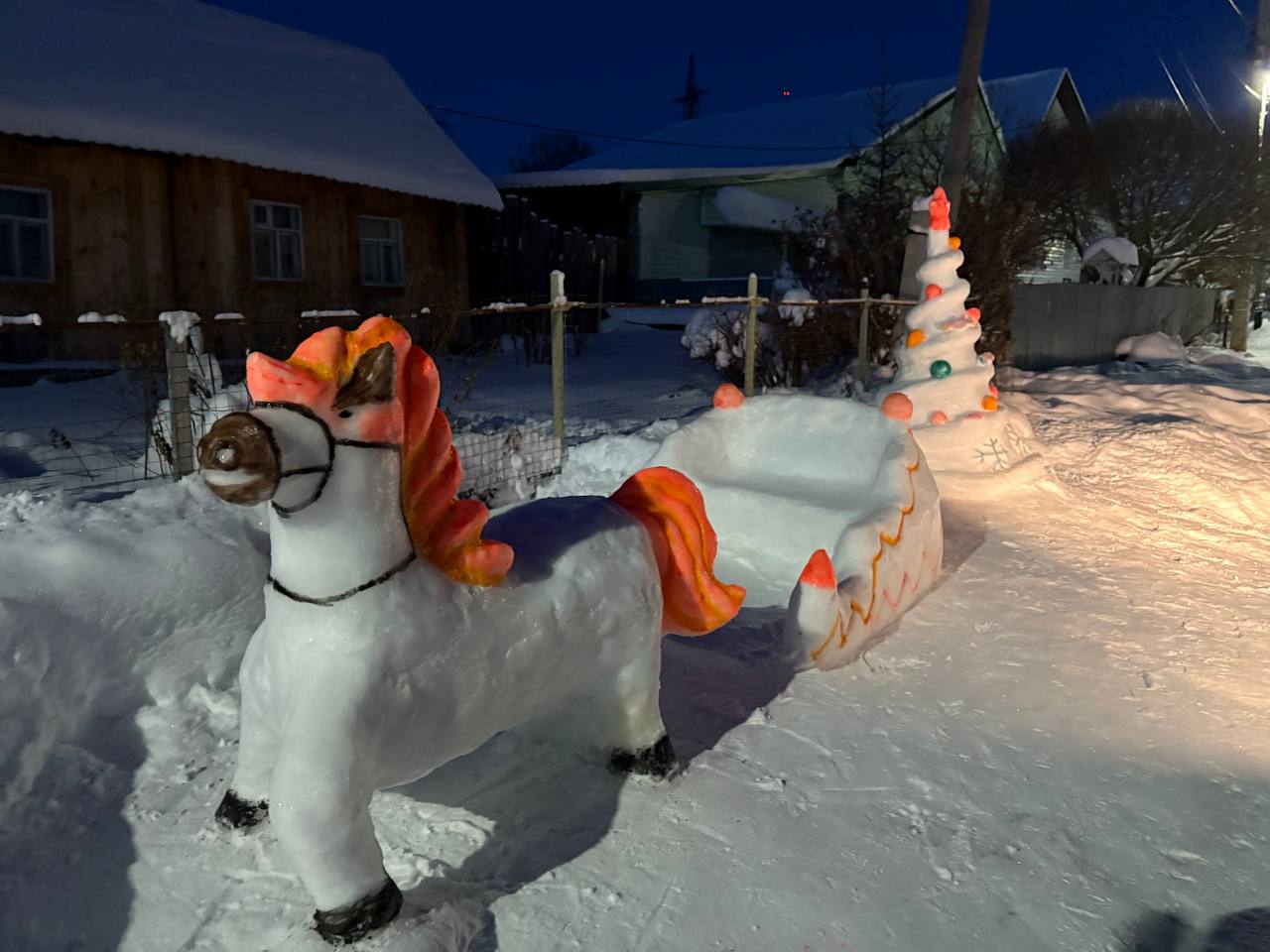 Второе место – Нэлли Шарапова, улица 9-я Демидовская, 17. Лепка ледяных статуй – легко! Символ года – лошадь – главная композиция ледяного городка.