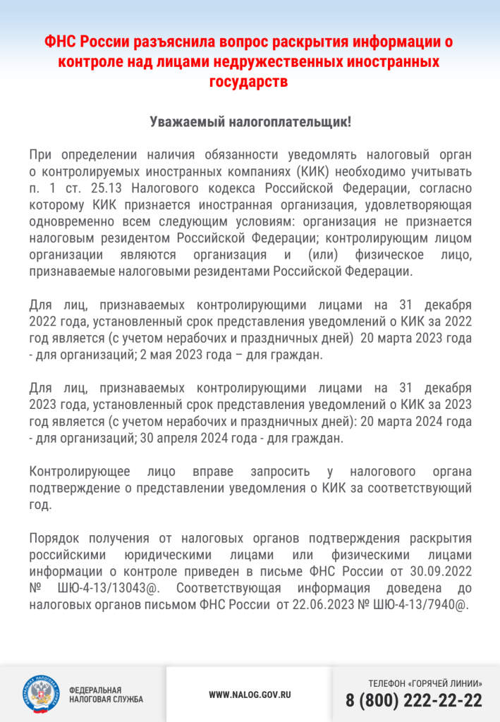 ФНС России разъяснила вопрос раскрытия информации о контроле над лицами недружественных иностранных государств