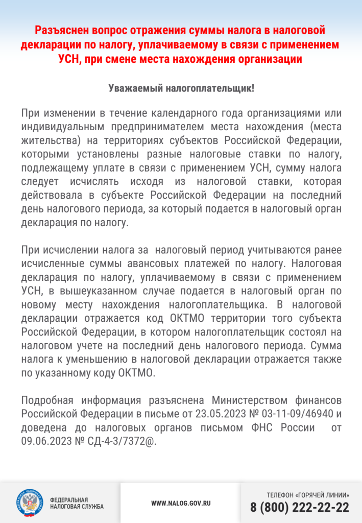 Разъяснен вопрос отражения суммы налога в налоговой декларации по налогу, уплачиваемому в связи с применением УСН, при смене места нахождения организации