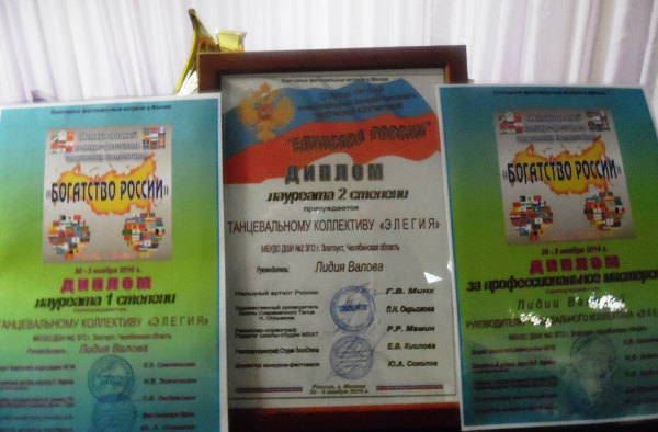 Жюри конкурсов высоко оценило выступление златоустовцев, присудив диплом Лауреата I степени в Международном конкурсе-фестивале «Богатство России» и диплом Лауреата II степени в конкурсе-фестивале «Единство России». Руководитель хореографического коллектива «Элегия» Лидия Валова была отмечена Дипломом за профессиональное мастерство.