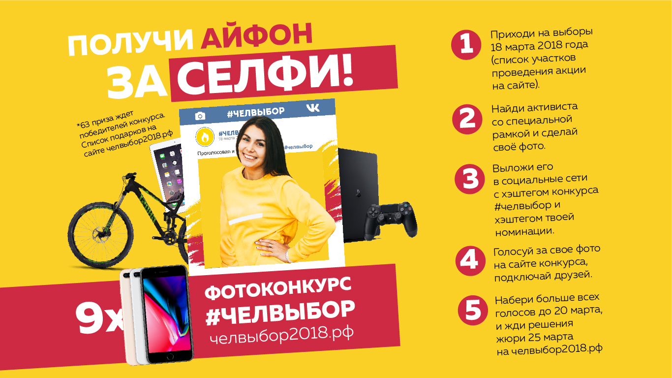 Учредителем события выступает Челябинская региональная молодежная общественная организация поддержки инициатив «Молодежная палата». Подробности о правилах проведения конкурса, адреса избирательных участков, количество призов можно узнать на сайте: www.челвыбор2018.рф и в сообществе: vk.com/chelvyibor.