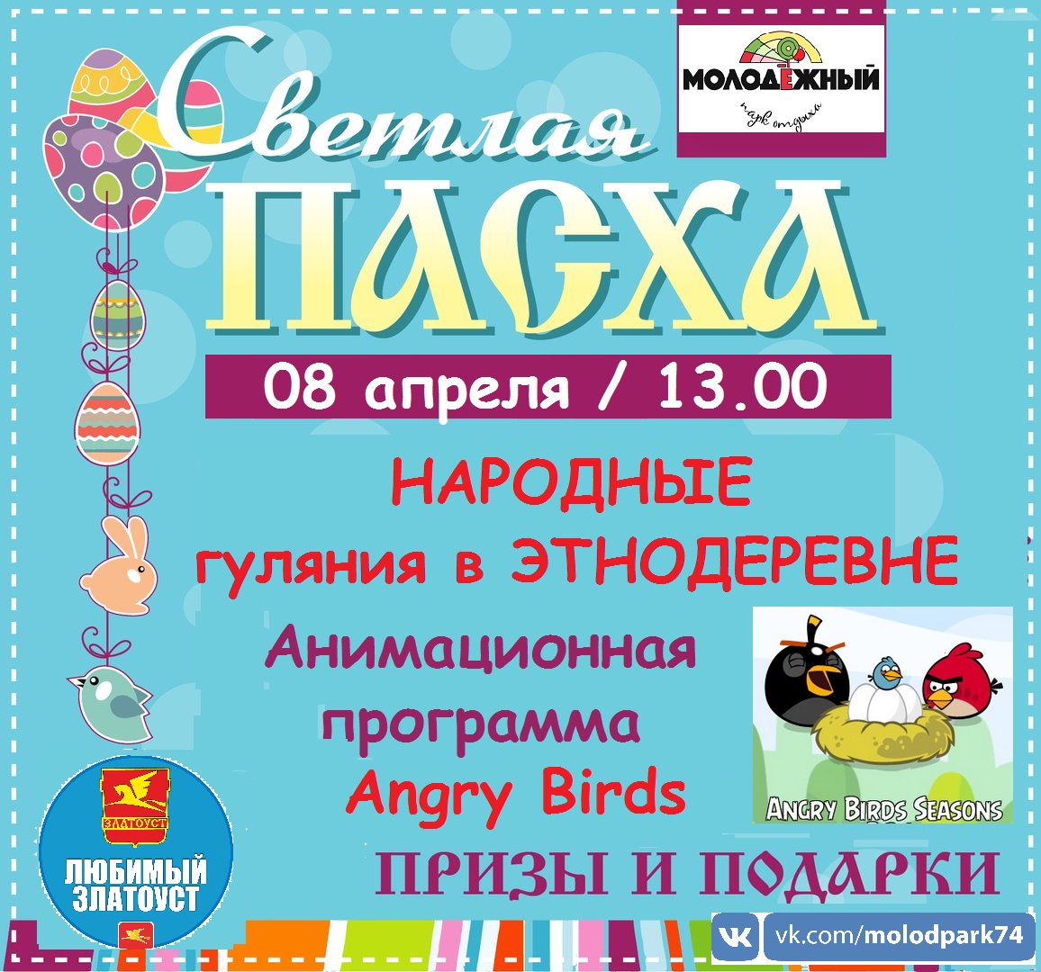 8 апреля с 13:00 любой желающий сможет принять участие в розыгрышах и викторинах, а малышей ждет программа «Angry Birds. Где искать золотые яйца?». Кроме того, в этот день в парке состоится творческий мастер-класс по росписи пасхальных пряников, сообщили в МАУ «Златоустовские парки культуры и отдыха».