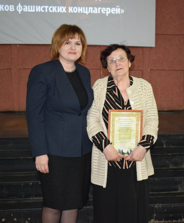 Заместитель главы округа по стратегическому развитию и инвестициям Вера Гусева вручила председателю организации малолетних узников фашистских лагерей Софии Ивановне Кирилловой Почетную грамоту главы Златоустовского городского округа и выразила благодарность всем, кто прошел тяжелые испытания в «лагерях смерти».