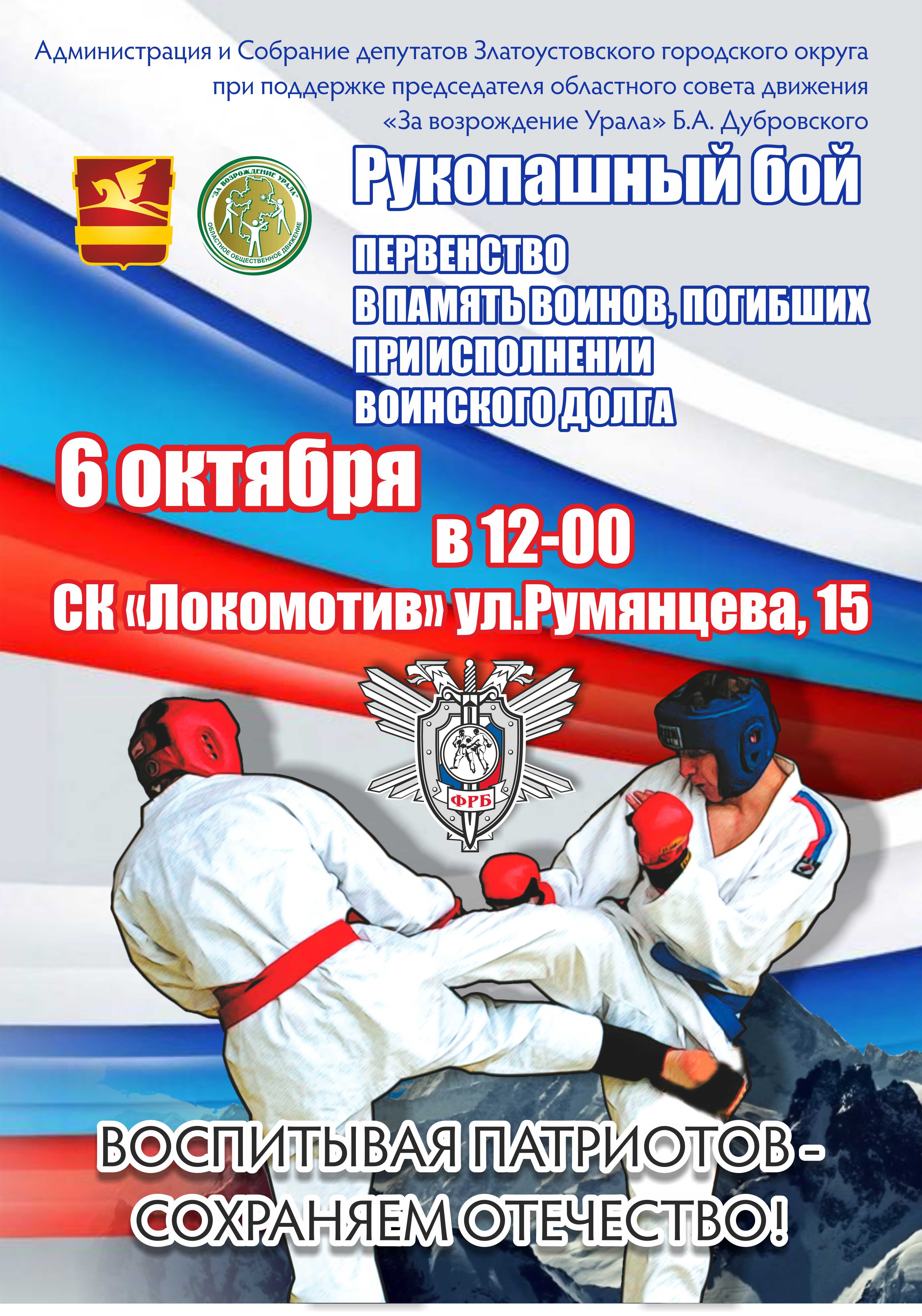 6 октября 2018 года в Златоустовском городском округе пройдет открытое первенство горнозаводского края по рукопашному бою, посвященное памяти воинов, погибших при исполнении воинского долга.