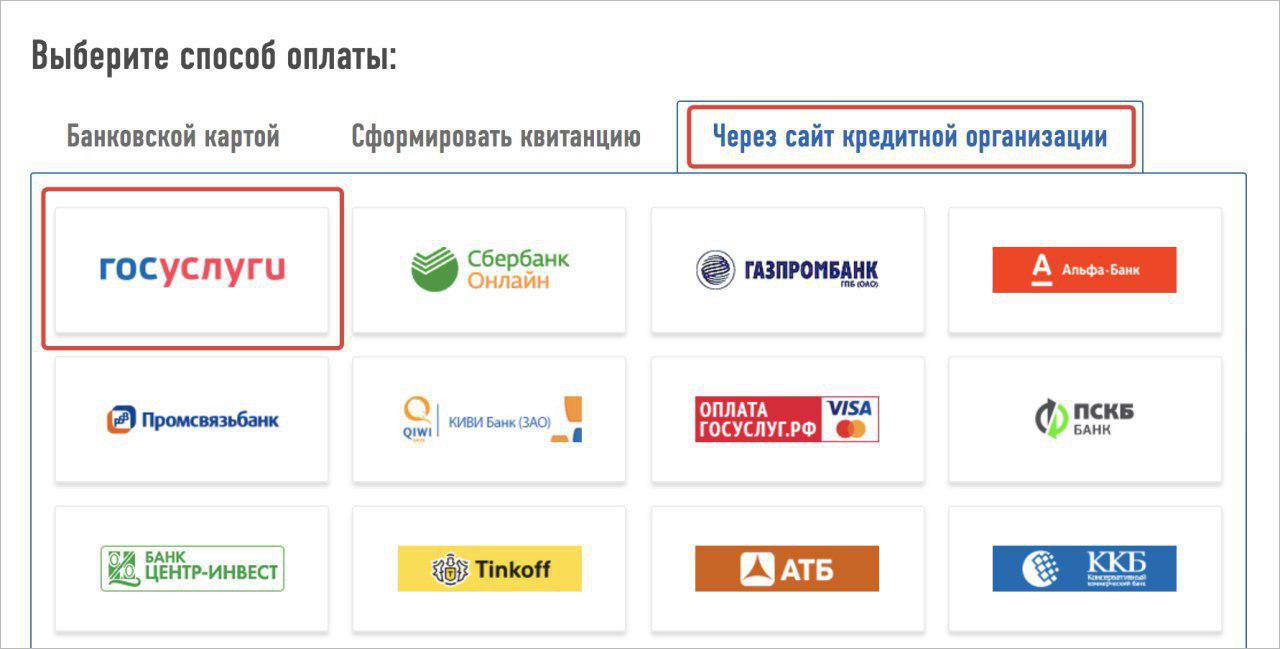 После этого нажмите кнопку «Оплатить» и укажите способ «Через сайт кредитной организации» – первыми в списке стоят Госуслуги.