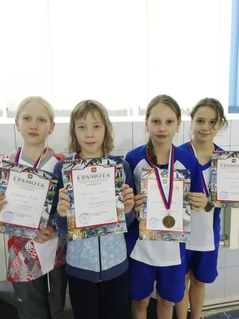 Алесия Соколова, Татьяна Короткова, Анна Ложкина и Кира Васильева (2009 г.р.) – 1 место в эстафете 4*50 вольным стилем.