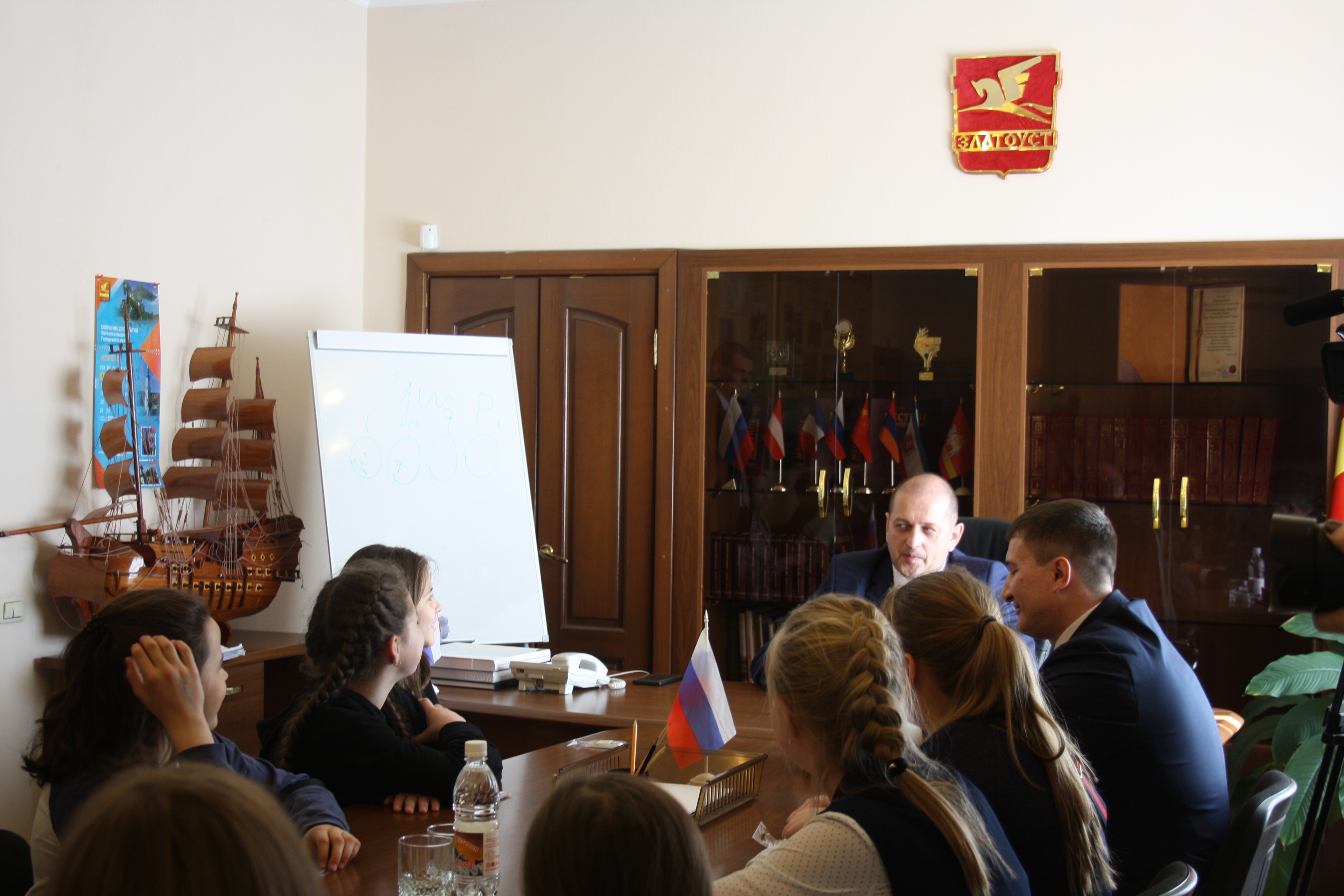 Затем поднялись на пятый этаж, прошли в зал заседаний. Там провели импровизированное совещание, на котором в непринужденной беседе школьники смогли задать Вячеславу Жилину все интересующие вопросы. Несмотря на их большое количество, каждый получил развернутый ответ.