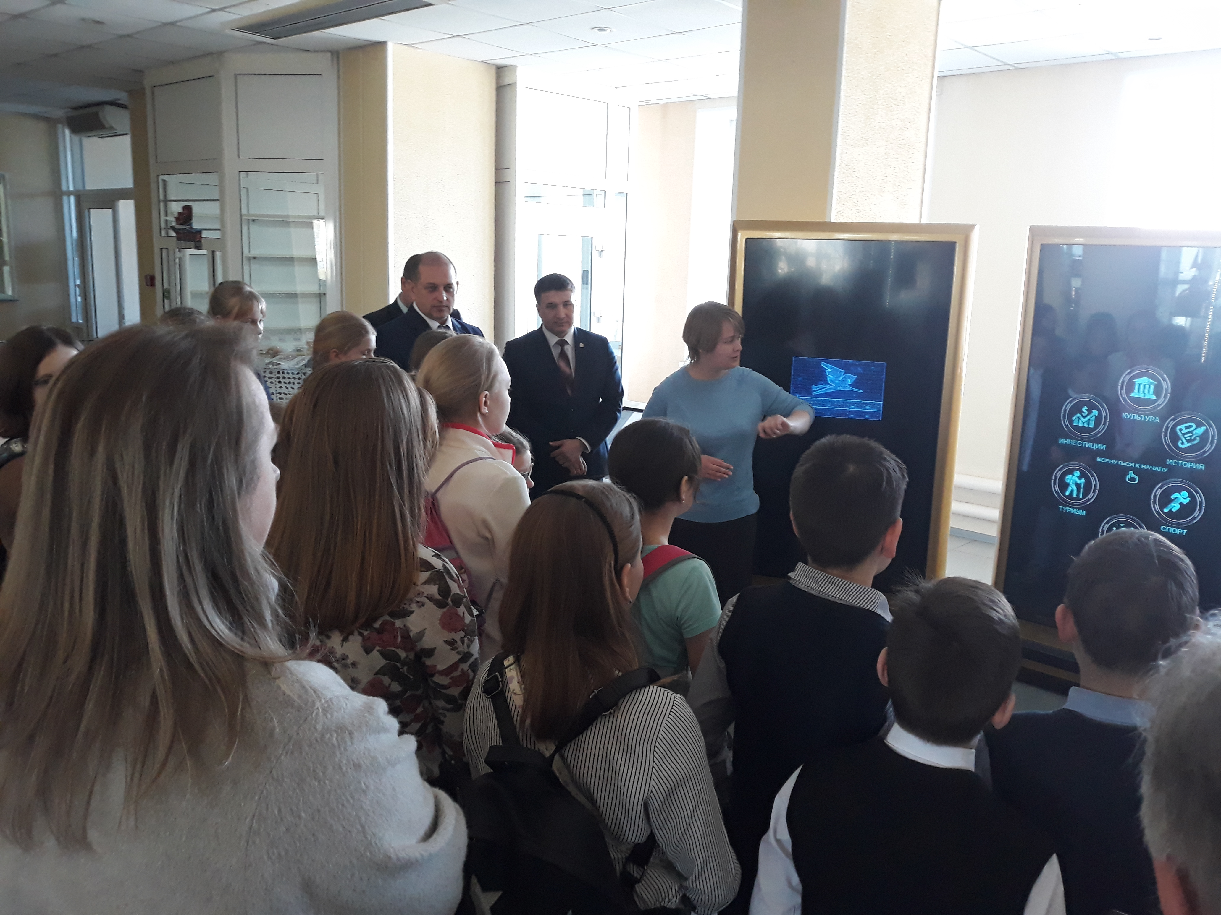 Началось знакомство с «Виртуального промоутера», который появился на первом этаже здания администрации совсем недавно. Его приобрели за счет средств гранта, который Златоуст получил в прошлом году как один из лидеров рейтинга муниципальных образований Челябинской области по инвестиционной привлекательности. Школьники долго изучали интерактивный сервис с информацией о родном городе, ведь посмотреть действительно есть на что – культура, история, спорт, современность, туризм, инвестиции. Осмотрели портретную галерею Почетных граждан, изделия местных художников-граверов и авторскую копию доспехов юного цесаревича Александра II.