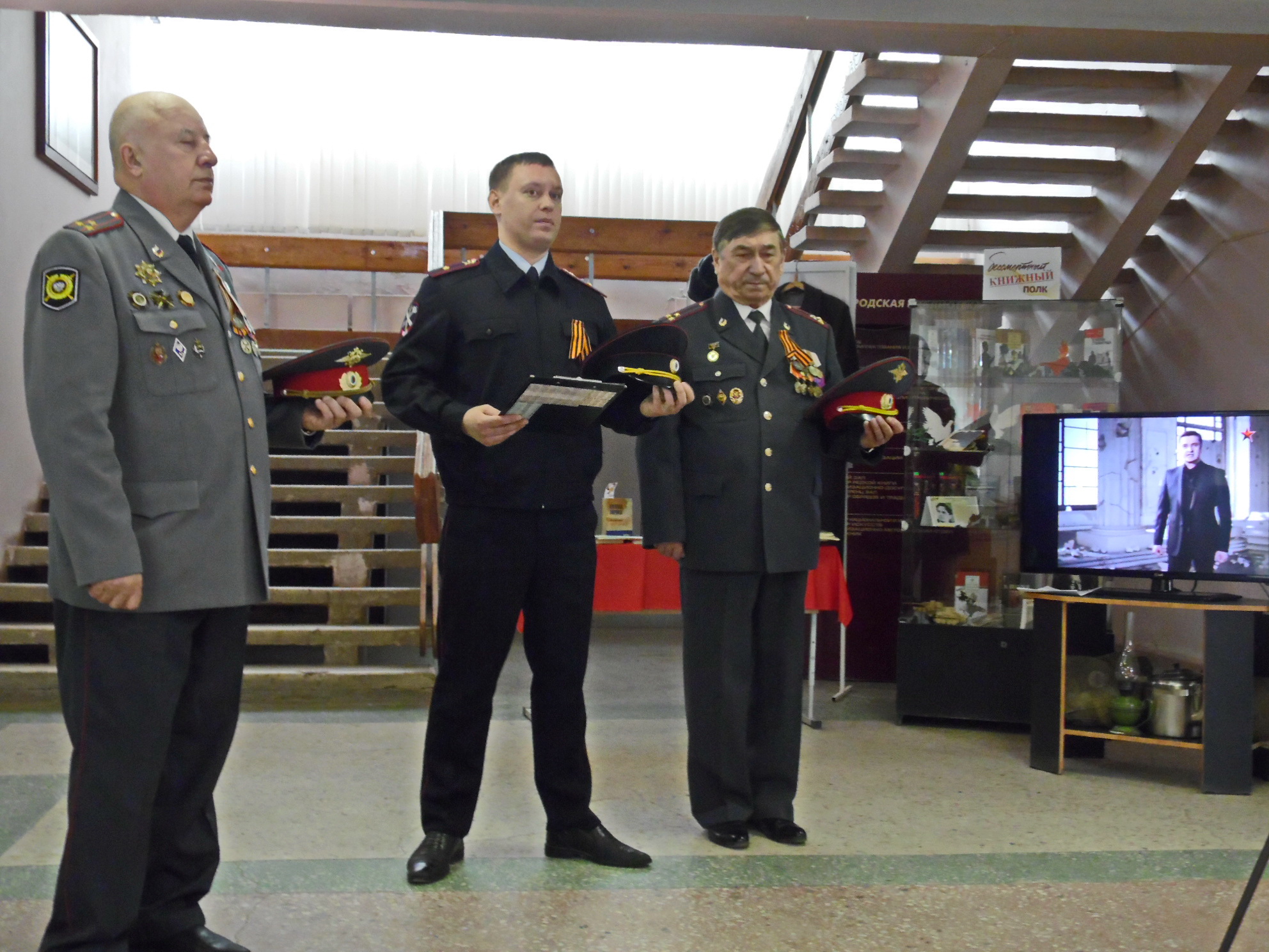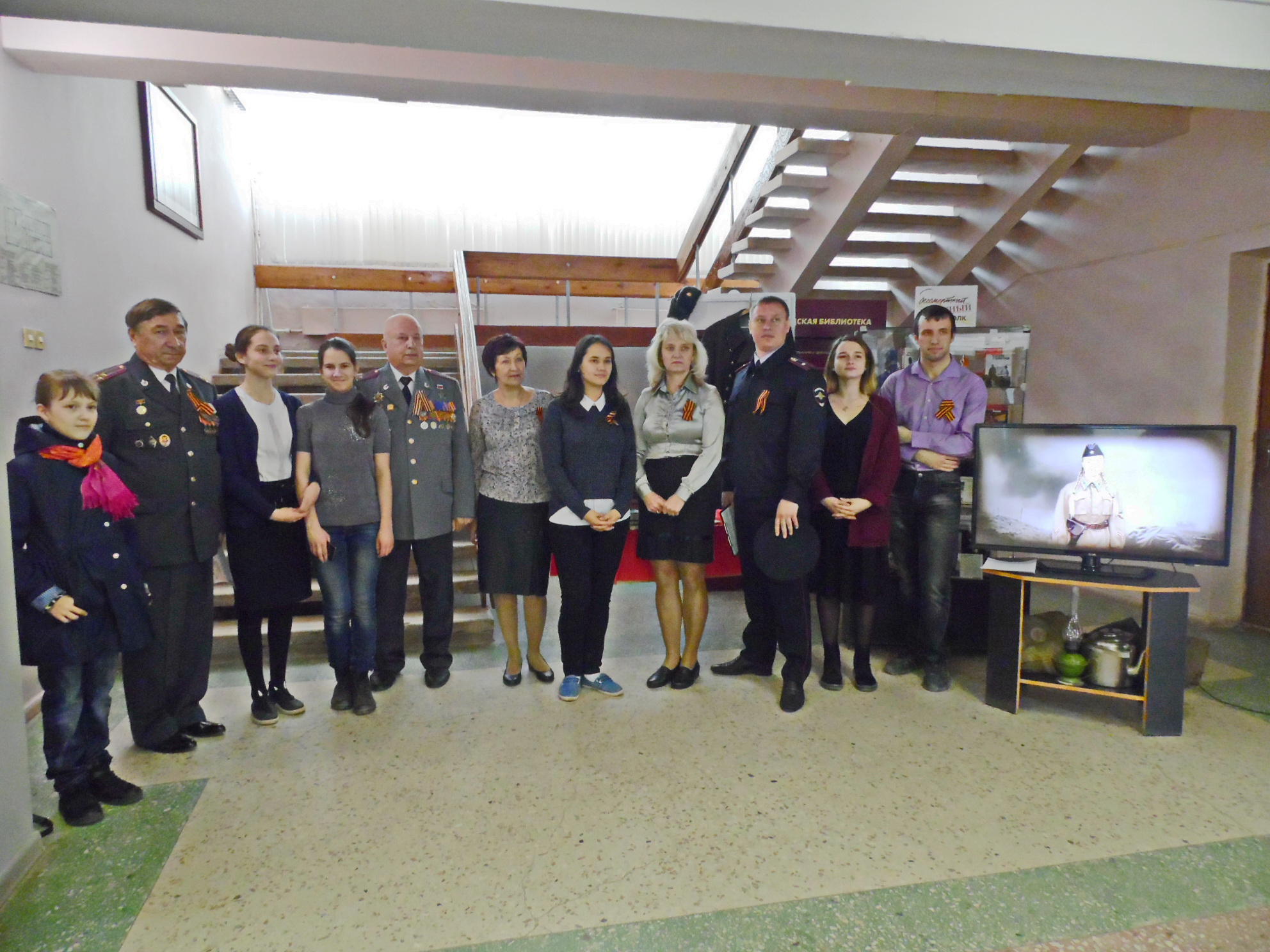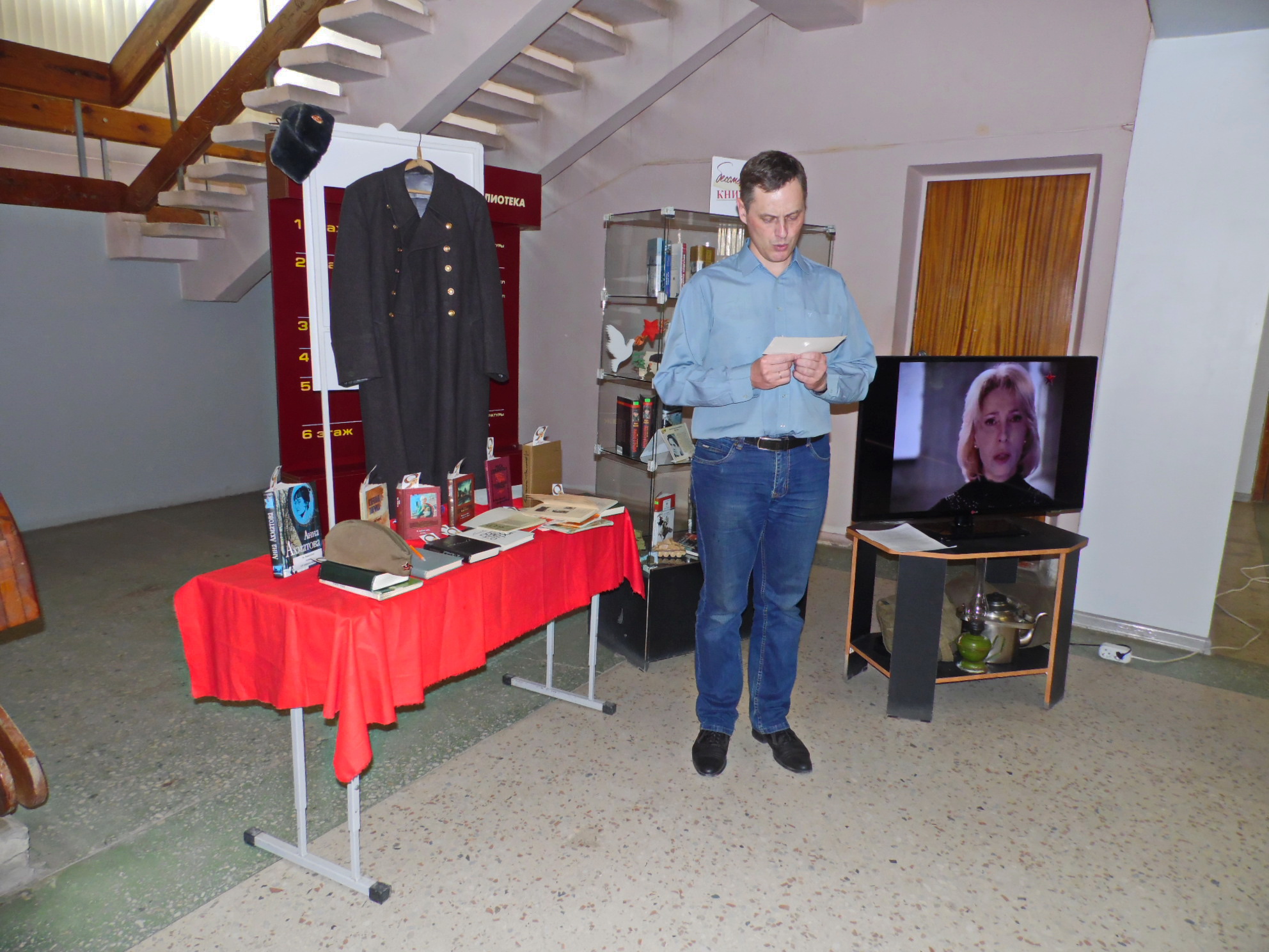 В память о поэтах и писателях военного времени в фойе Центральной городской библиотеки была организована выставка-инсталляция, где рядом с предметами солдатского быта – шинелью, чайником, керосиновой лампой, вещмешком, пилоткой, – стояли портреты писателей военных лет и книги с их произведениями.