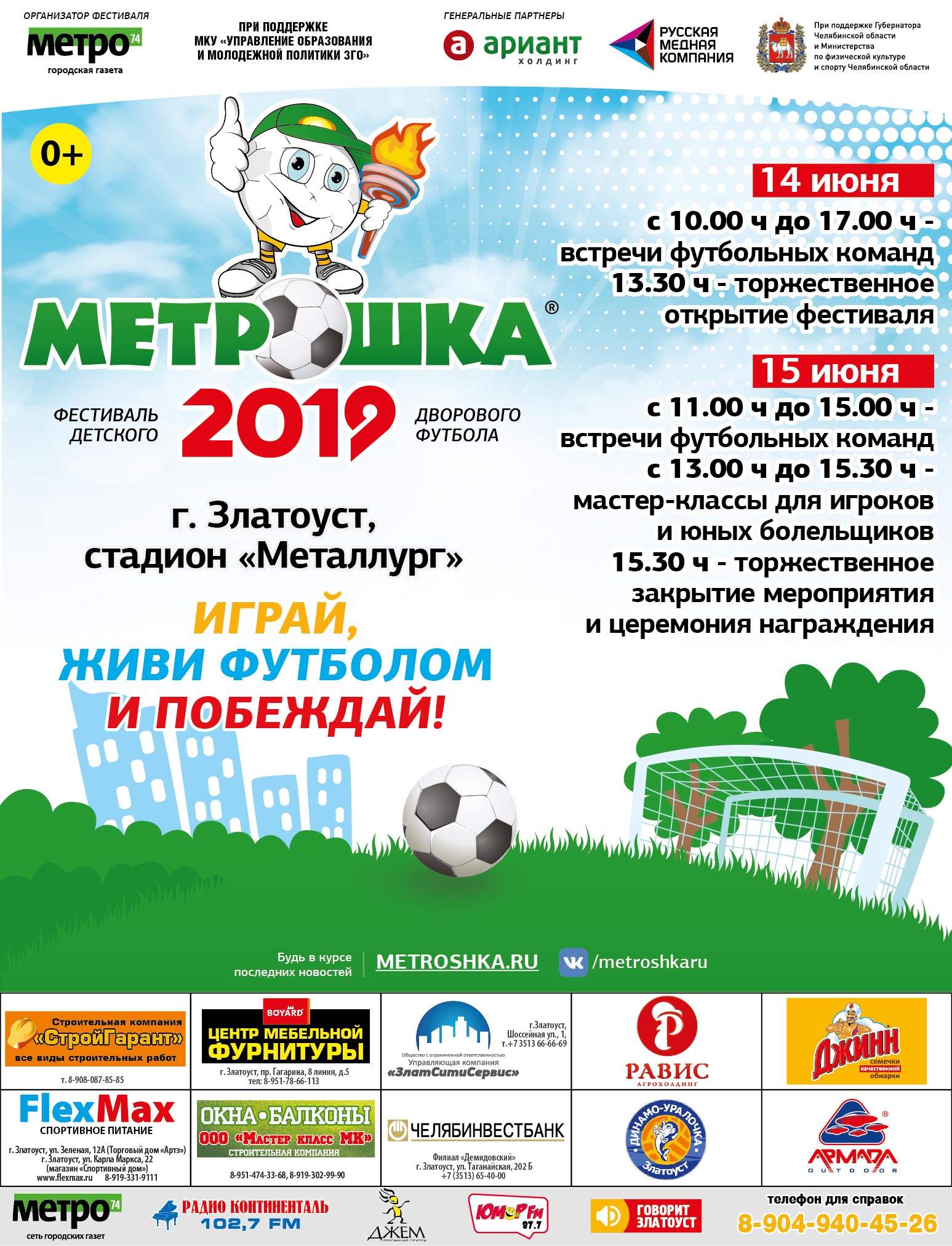 Всех горожан в пятницу и субботу приглашают на стадион – насладиться острыми поединками на поле и концертом, поддержать будущих кудесников мяча и принять участие в увлекательных мастер-классах. Приходите всей семьей, посетите праздник детства и спорта.