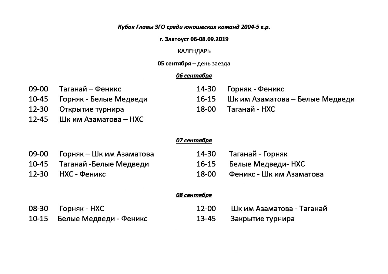 Хоккейный турнир проходит в физкультурно-оздоровительном комплексе с искусственным льдом «Таганай» с 6 по 8 сентября. В нем принимают участие шесть команд: «Феникс» (г. Заречный, Свердловская область), «Горняк» (г. Кушва, Свердловская область), «Белые Медведи» (г. Челябинск), воспитанники спортивной школы № 3 им. М. М. Азаматова (г. Уфа), «Нефтехимсервис» (г. Новокузнецк) и златоустовский «Таганай».