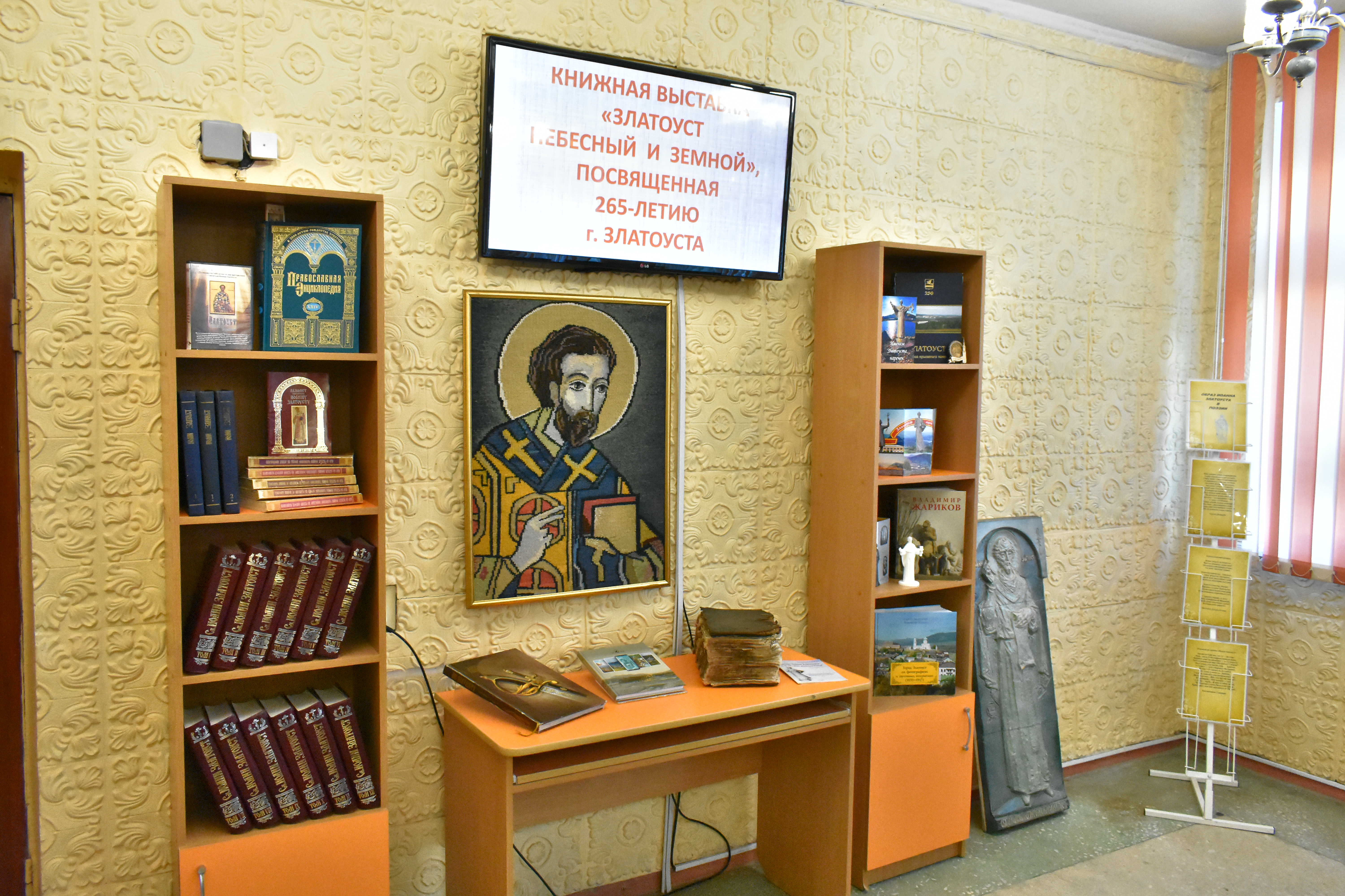 Участники встречи познакомились с полным собранием сочинений святителя Иоанна Златоуста, изданиями о мастерах города Златоуста, иллюстрированными альбомами местных краеведов, книгой Александра Козлова «Златоуст в красках или четыре путешествия в прошлое и настоящее города крылатого коня». Особое внимание на выставке было уделено самой редкой книге Центральной городской библиотеки – «Беседы Иоанна Златоуста на 14 посланий апостола Павла», изданной в 1623 году. Эта уникальная книга была подарена библиотеке в 1996 году к 100-летнему юбилею.