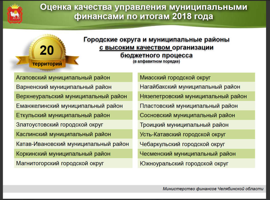 Только 7 из 43 территорий Челябинской области (в том числе Златоустовскому городскому округу) в период непростой экономической ситуации удалось в предшествующие три года удержать позицию в группе с высоким качеством организации бюджетного процесса.