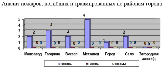 – на пожарах в текущем году травмированных так же не зарегистрировано, в аналогичный период прошлого года на пожарах травмировались 3 человека, отмечается снижение количества травмированных на пожарах людей на 3 случая;