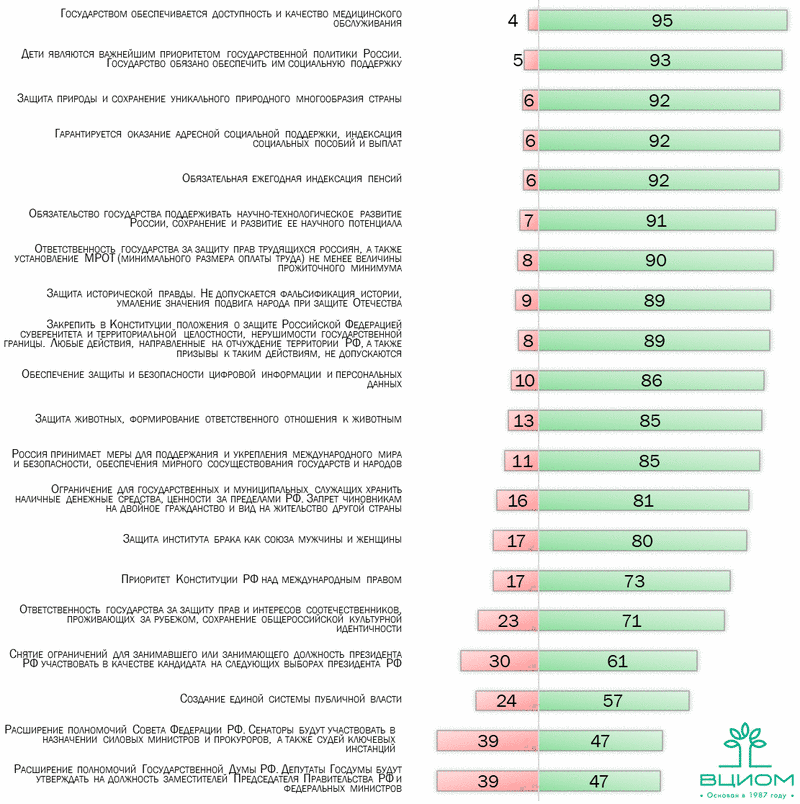 Среди конкретных поправок, предложенных для оценки нашим соотечественникам, наиболее важной россияне считают со стороны государства обеспечить доступность и качество медицинского обслуживания (95%). Также значимо для россиян признание детей приоритетным направлением государственной политики и обязательное предоставление им социальной поддержки (93%).