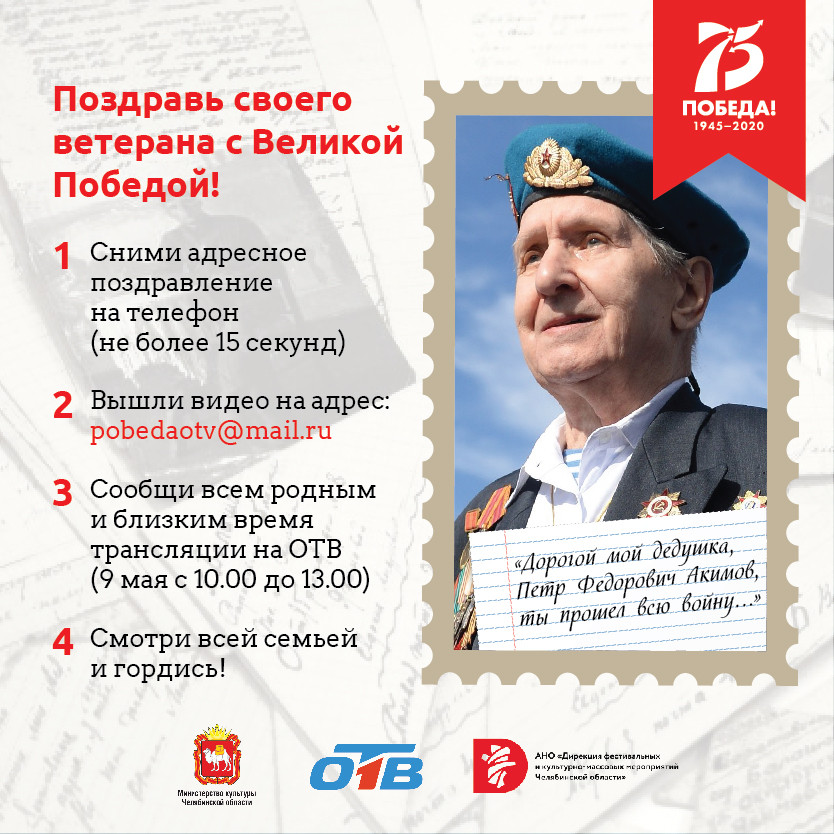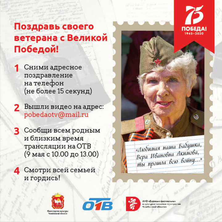 В преддверии 9 мая министерство культуры Челябинской области, дирекция фестивальных и культурно-массовых мероприятий и телеканал ОТВ запускают народный проект поздравления ветеранов.