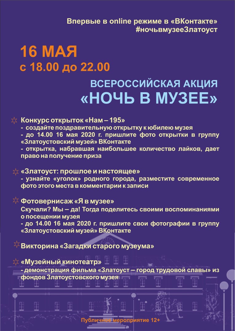 Жители города могут присоединиться в акции не только в Златоусте. Обширные онлайн-программы представят областные государственные музеи и девятнадцать муниципальных музеев области. На своих сайтах и в аккаунтах в социальных сетях южноуральские музеи представят разнообразные по форме и содержанию программы.