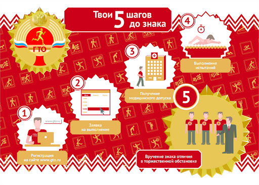 Третий шаг – прохождение медицинского осмотра для допуска к выполнению нормативов и получение разрешения к выполнению нормативов комплекса. Четвертый шаг – выполнение испытаний (тестов) ГТО. Пятый шаг – получение знака отличия ГТО.