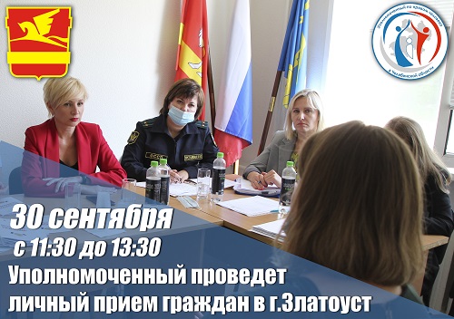 Омбудсмен проведет совместный с управлением министерства юстиции Российской Федерации по Челябинской области, управлением федеральной службы судебных приставов по Челябинской области и управлением Росреестра по Челябинской области прием златоустовцев в здании администрации округа по адресу: ул. Таганайская, 1, кабинет № 110 с 11.30 до 13.30. Запись на прием осуществляется в приемной уполномоченного по правам человека в Челябинской области по телефону 8 (351) 737-15-41.