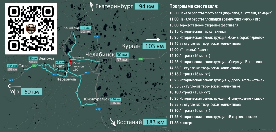 В ходе статического и динамического показа будут задействовано более 30 современных боевых машин, стоящих на вооружении уральской танковой дивизии ЦВО и более 20 исторических танков и автомобилей. Также для посетителей фестиваля будет организована концертная программа с участием творческих коллективов Челябинской области.