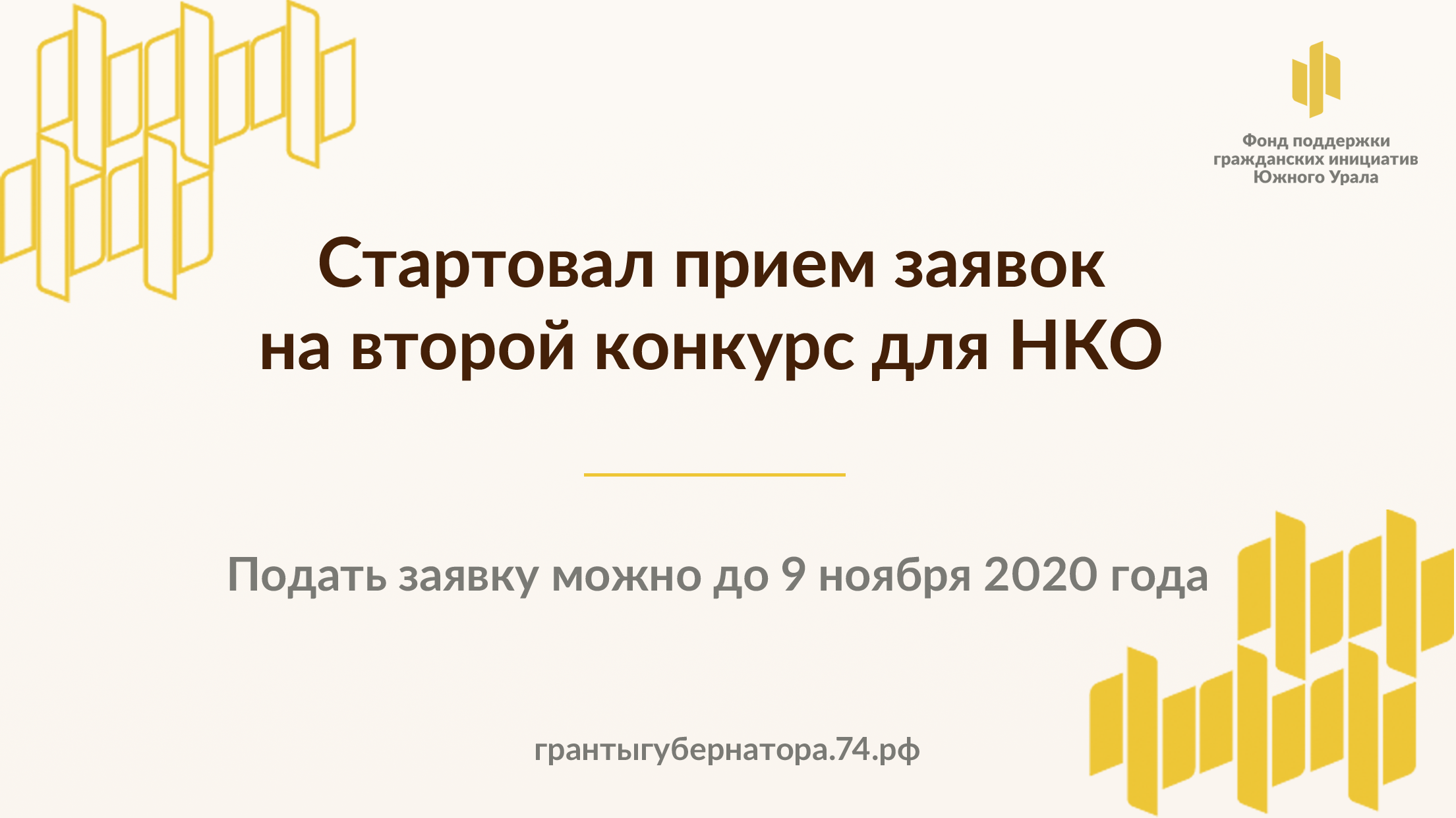 5 октября по указанию губернатора Челябинской области Алексея Леонидовича Текслера стартовал прием заявок на второй конкурс грантов на развитие гражданского общества для социально ориентированных некоммерческих организаций. Оператором конкурсов является Фонд поддержки гражданских инициатив Южного Урала.