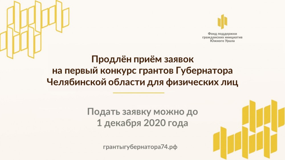 Фонд поддержки гражданских инициатив Южного Урала принял решение продлить срок приема заявок на конкурс грантов губернатора Челябинской области для физических лиц до 1 декабря 2020 года. Объявление результатов конкурса – не позднее 28 декабря 2020 года.