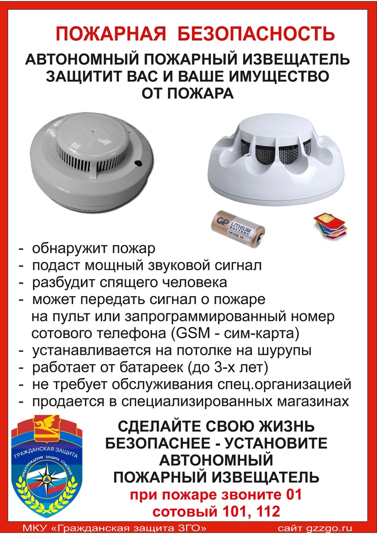 Во избежание возникновения пожара, не оставляйте без присмотра включенные в сеть электроприборы, работающее газовое оборудование или топящиеся печи, не пользуйтесь поврежденными розетками, не оставляйте малолетних детей без присмотра. Большинство потерпевших от пожаров находились в состоянии сна, поэтому рекомендуется установить автономные дымовые пожарные извещатели.