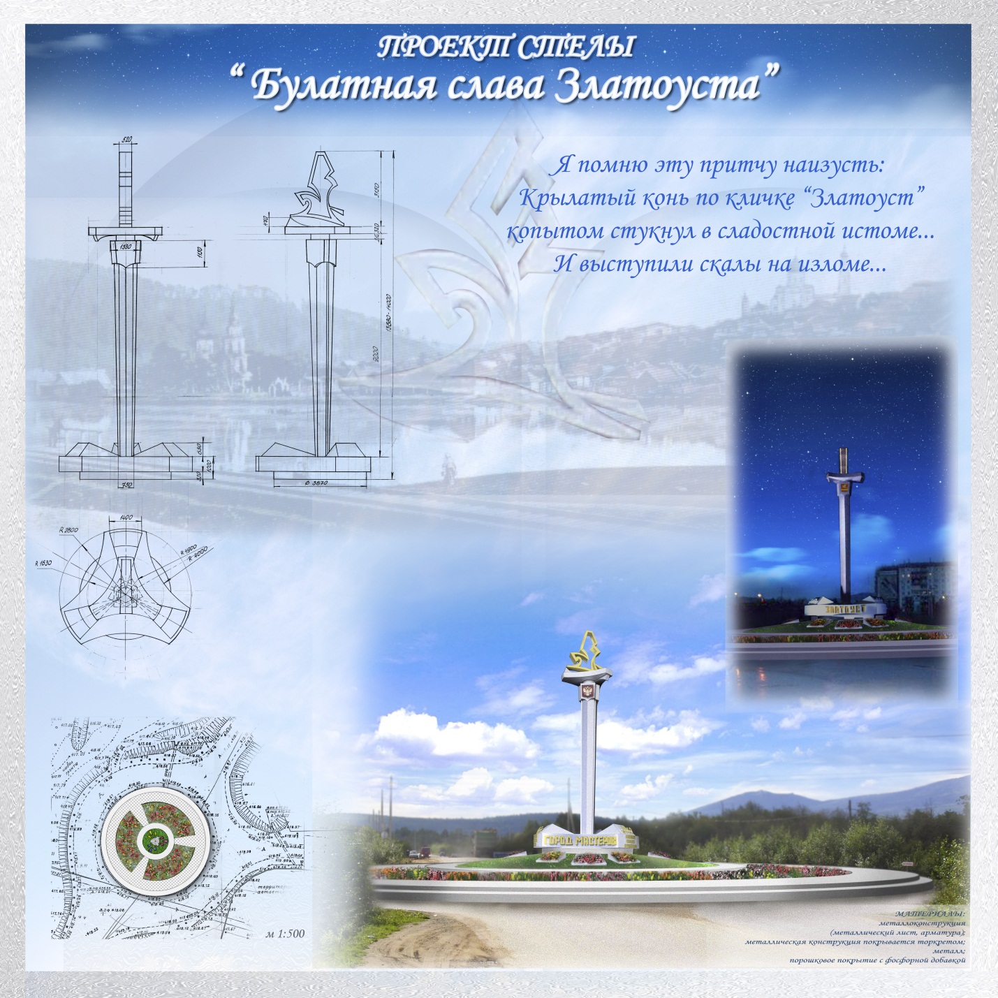 В августе этого года мэрия Златоуста объявила конкурс на лучший эскизный проект оформления кольцевой транспортной развязки в районе машзавода. К участию были приглашены профессиональные скульпторы, архитекторы, дизайнеры и просто талантливые люди. В итоге на суд жюри было представлено 6 проектов. Все они были размещены на официальном сайте Златоустовского городского округа, и жители города могли обозначить своё мнение, проголосовав за наиболее понравившийся эскиз.