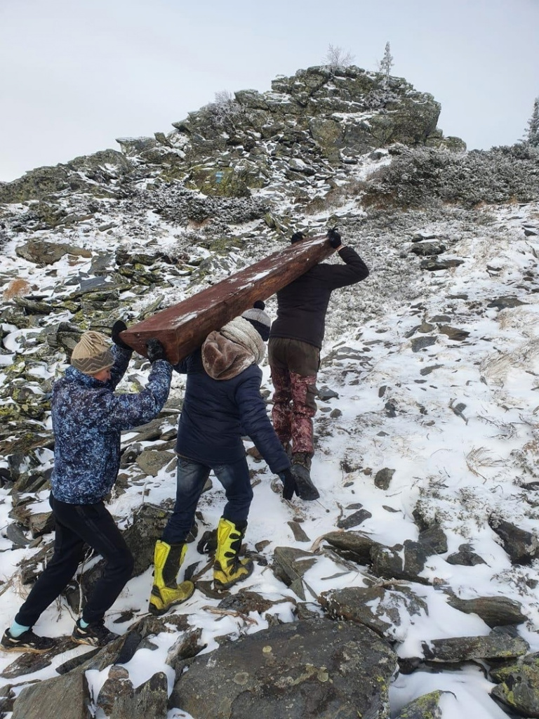 Завершающий этап работ пришлось проводить в условиях сильного снегопада. Доски и брёвна весом около 100 кг. каждое пришлось поднимать на вершину вручную. Специалисты и волонтёры работали в условиях шквалистого ветра.