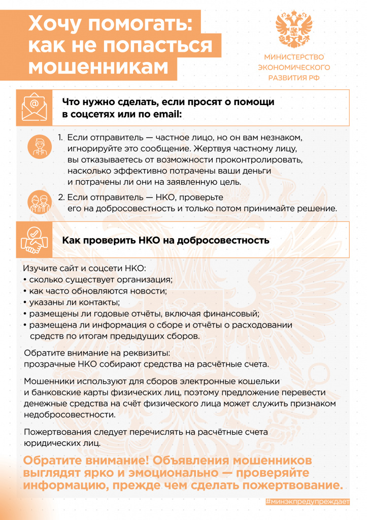 Министерство экономического развития России разработало буклеты с информацией о том, как проверить благотворителей на добросовестность, что нужно сделать, если попросят о помощи в соцсетях или по e-mail, что должен содержать ящик для сбора пожертвований.