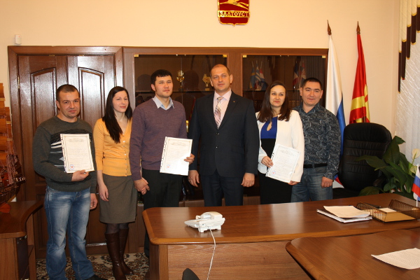 Глава Златоуста Вячеслав Жилин вручил трем молодым семьям свидетельства о праве на получение социальной выплаты на приобретение или строительство жилья.