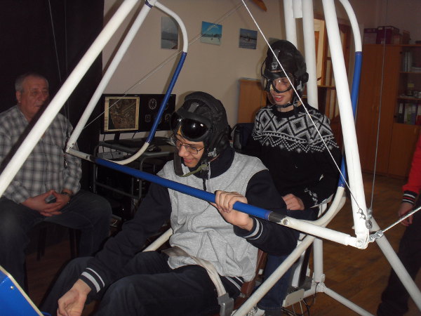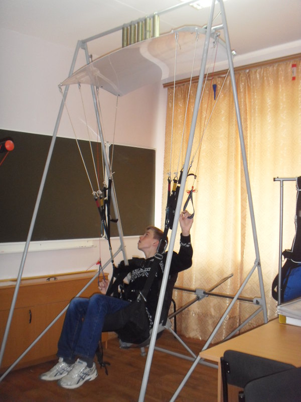 После полетов на дельтаплане ребят провели в спортзал, где им продемонстрировали отработку внештатных ситуаций при аварийной посадке самолета и спуске людей через надувной трап. Моделистам рассказали, как обучают экипаж при экстренном покидании самолета, а так же показали, как покинуть самолёт родителям с маленькими детьми.