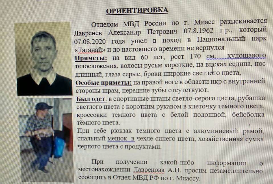 Как сообщалось ранее, сотрудники Отдела МВД России по ЗГО ведут поиски без вести пропавшего Жителя Миасс: Лавренева Александра Петровича, 07.08.1952 года рождения, уроженца г.Миасс, Челябинской области, который 07.08.2020 находясь на территории г.Златоуст отправился в туристический поход в НП «Таганай» и до настоящего времени его местонахождение неизвестно.