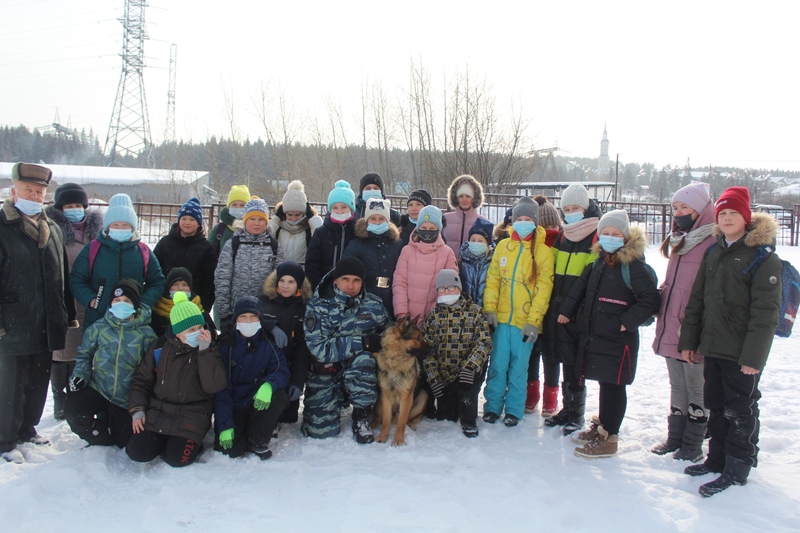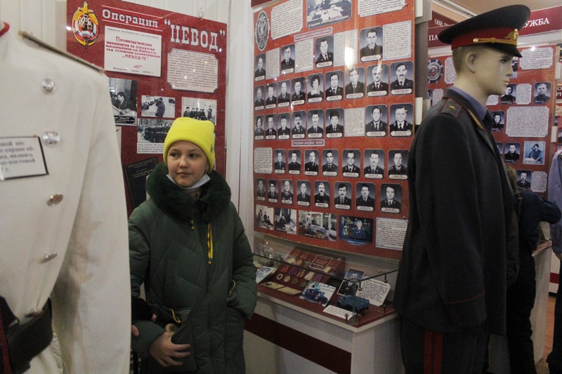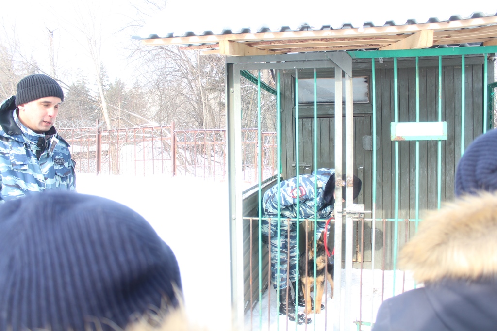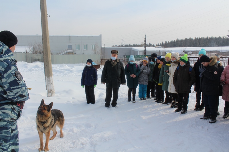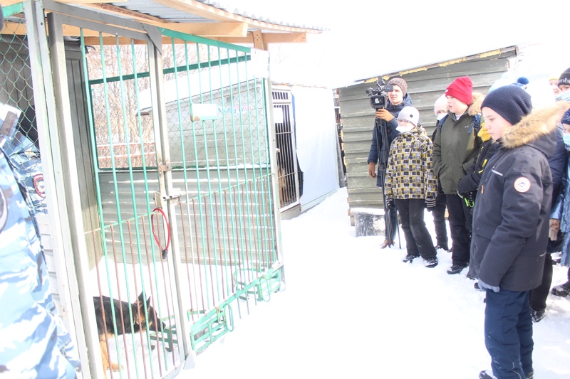 На экскурсию в музей были приглашены школьники младших классов школы №25. Знакомство с работой полиции начали с работы кинологической группы. Инспектор кинологической группы ОМВД лейтенант полиции Дамил Камалов продемонстрировал учащимся навыки служебной собаки «Вираж» и рассказал о службе сотрудниц кинологов, несущих службу. Всего в группе 8 кинологов, 4 из которых девушки кинологи в погонах. Во время посещения питомника со своей собакой по кличке Шелли работала кинолог конвойного подразделения ОМВД, сержант полиции Мария Челпанова. Мария с 2018 года пришла на службу в полицию после окончания колледжа по специализации «кинология». Свою служебную собаку Мария приняла со щенков и на днях после прохождения стажировки они вдвоем с Шелли приступили к службе. Дамил Камалов отметил, что кинологи женщины успешно обучают собак, окружают своих питомцев материнской любовью.