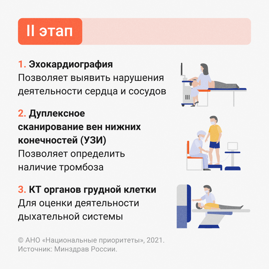 По результатам первого этапа врачи определят риски и возможные признаки развития хронических заболеваний, при необходимости направляют пациента на 2 этап. Он включает эхокардиографию, КТ легких и допплеровское исследование сосудов нижних конечностей. Если у пациента выявят хронические заболевания или риски их возникновения, то ему назначат лечение и реабилитацию.