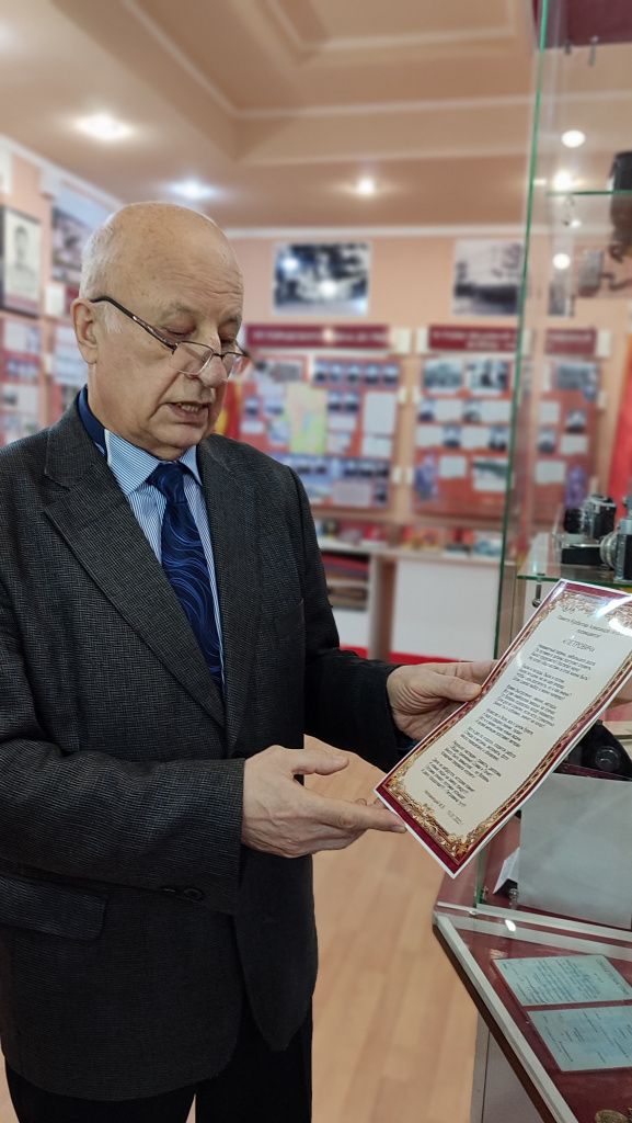 На фото: стенд в музее, посвященный Курбатову; сын Александра Курбатова Андрей с Владимиром Бобылевым перебирают семейные фотографии; внук Михаил рассказывает съемочной группе «Златоустовского телевидения» о своем дедушке.