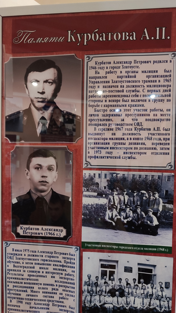 — Способности Александра Петровича были отмечены руководством. Ему предложили должность участкового инспектора милиции. Поступил же он службу в 1965 году по направлению партийной организации трамвайного управления и назначен на должность милиционера патрульно-постовой службы. Далее он пошел вверх по карьерной лестнице и в 1990 был назначен начальником экспертно-криминалистического отделения УВД Златоустгорисполкома, которое возглавлял вплоть до отставки в 97 году. В общей сложности Курбатов отдал делу становления экспертно-криминалистической службы в нашем городе 22 года своей жизни, — отметил основные вехи службы товарища Владимир Иванович. — Десять лет назад Александр Курбатов ушел из жизни. И это очень большая потеря для златоустовской полиции. Нам его не хватает. Он был грамотным человеком. Любил помогать всем. Наверное, сгорел на работе. Только приходил домой со службы, как за ним приезжала машина — надо выезжать на преступление. Не считался ни временем, ни семьей… Словом, работал на износ. Это талант, который оставил большой след в истории полиции. Хороший наставник, которого помнят сотрудники. Мы ему очень благодарны и сегодня продолжаем его дело!