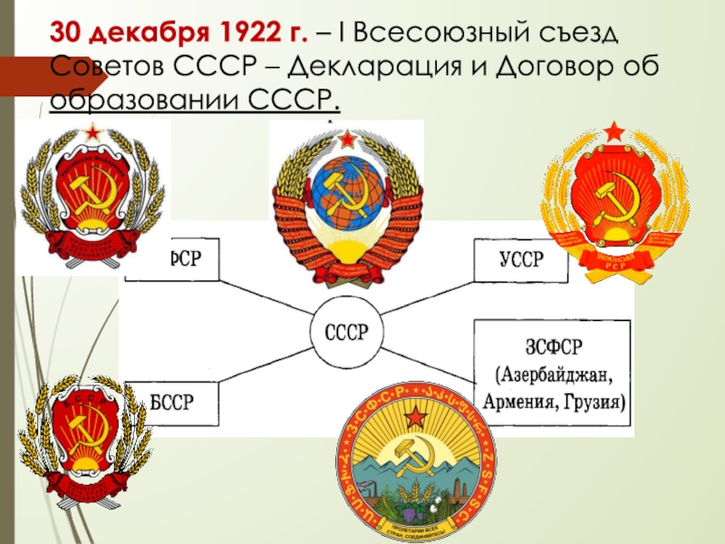 Это новое государственное образование должно было воплотить надежды всех народов и народностей бывшей Российской империи после кровопролитной Гражданской войны на мирную созидательную жизнь, на возможность работать, учиться, растить детей. Это было первое в мире социалистическое государство, государство в котором все народы и народности имели равные права, которое базировалось на принципах пролетарского интернационализма. Советский Союз был федеративным социалистическим государством. Первоначально в него вошли 4 союзные республики: РСФСР, УССР, БССР, ЗСФСР (Закавказская). 31 января 1924 года II съезд Советов СССР принял Конституцию, которая завершила юридическое оформление Советского Союза.